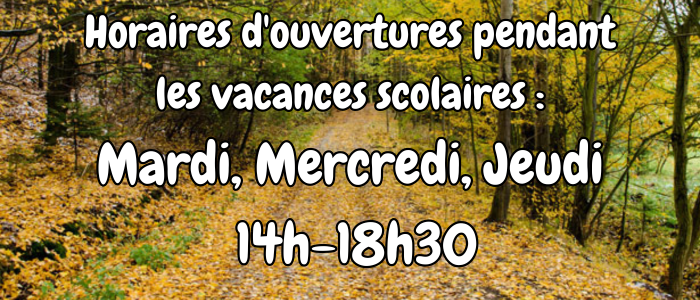 Pendant les vacances scolaires le Mardi, Mercredi et Jeudi de 14h à 18h30.